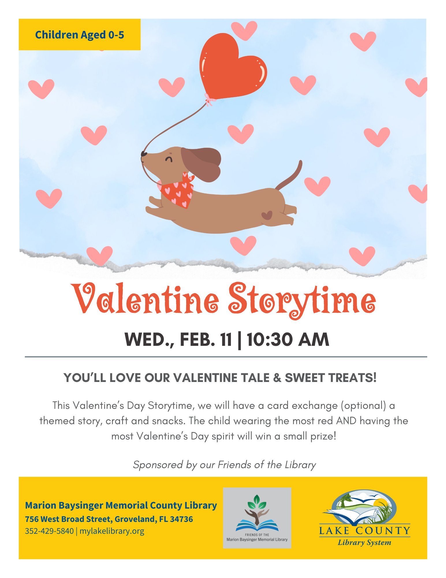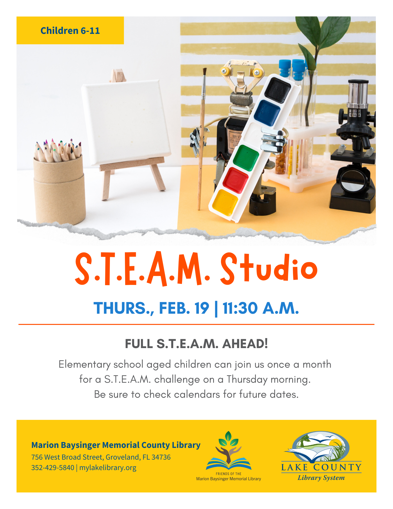 Calendar of EventsFebruary-March 2026 Friends of the Library Ongoing Workshops - Tuesdays 12:30-2PM March 10-April 7 Egg Hunt Storytime WED April 1st 10:30AM Marion Baysinger Memorial Library February 2026 Download READing Paws S.T.E.A.M. Studio How to Use Your Laptop 101 Readers Collective Book Club Yarnivores Knitting & Crocheting Club Blind Date With A Book Valentine Storytime Polar Bear Bingo Marion Baysinger Memorial County LIbrary March 2026 Download READing Paws S.T.E.A.M. Studio How to Use Your Laptop 101 Readers Collective Book Club Yarnivores Knitting & Crocheting Club Valentine Storytime New List Item