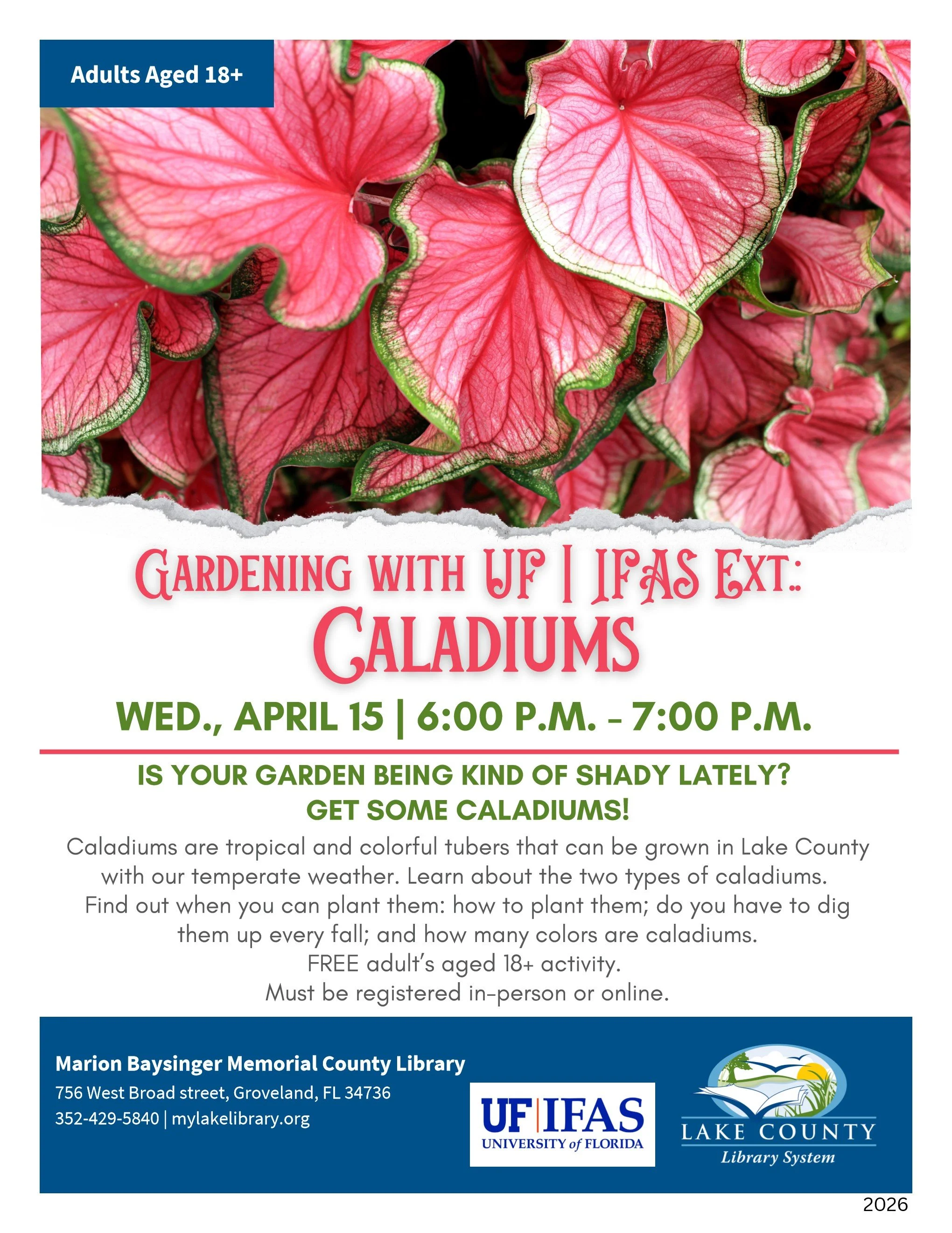Calendar of EventsA Spoonful of Sugar, Sunday, April 12th VOLUNTEERS and baked good donationa requested for A Spoonful of Sugar April 11-12(see A Spoonful of Sugar page for direct link sign up) Marion Baysinger Memorial County Library March 2026 Download Download READing Paws S.T.E.A.M. Studio How to Use Your Laptop 101 Readers Collective Book Club Yarnivores Knitting & Crocheting Club Valentine Storytime March Madness Marion Baysinger Memorial County Library April 2026 Download Download Adult Spring Floral Workshop Gardening With UF: Caladiums Canasta Connection Egg Hunt Storytime Yarnivores Knitting & Crocheting Club S.T.E.A.M. Studio Readers Collective Book Club READing Paws How to Use Your Laptop 101 Basic Forensic Art Class
